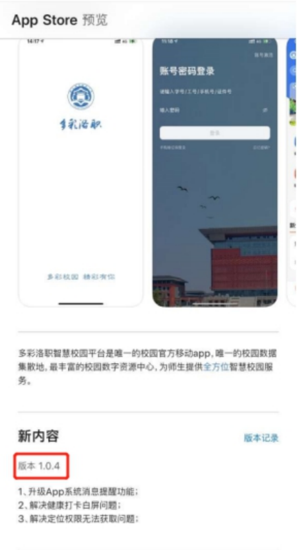 用户打开App store,升级多彩洛职iOS最新版本1.0.4。升级完成之后,退出App,使用学工号登陆打卡;