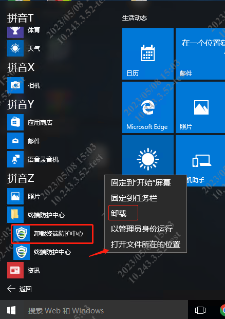 打开Windows开始菜单栏,定位“aES终端防护中心”,点击<卸载终端防护中心>或者右键点击<终端防护中心>-<卸载>,按提示进行卸载,如下图所示。