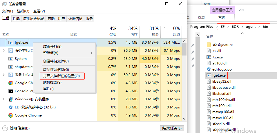 PS:验证静默安装过程:可打开<任务管理器>查看到有fget.exe进程在运行,正在获取文件,进行aES静默安装中;也可右键打开aES默认安装目录SF/edr/agent/bin,通过不断刷新查看有新文件正在产生